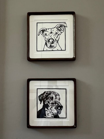 You send me photos of your furry friend (the more pics, the better). I'll use the photos to create a sketch that captures each animal's personality. Once the sketch is approved by you, I'll get to carving and printing!